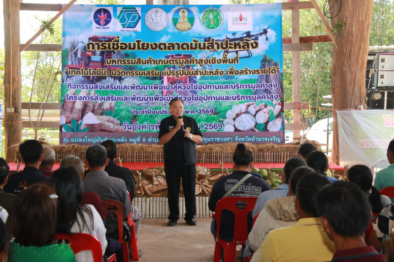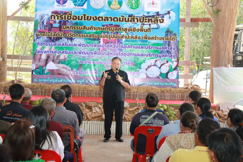 วันที่ 10 มีนาคม 2569 นายเสนีย์ ส้มเขียวหวาน ผู้ว่าราชการจังหวัดอำนาจเจริญ เป็นประธานเปิดงานการเชื่อมโยงตลาดมันสำปะหลัง มหกรรมสินค้าเกษตรมูลค่าสูงเชิงพื้นที่ ภายใต้แนวคิด “เทคโนโลยีนำ นวัตกรรมเสริม แปรรูปมันสำปะหลัง เพื่อสร้างรายได้” ตามโครงการส่งเสริมและพัฒนาเพื่อเข้าสู่ห่วงโซ่อุปทานและบริการมูลค่าสูง ประจำปีงบประมาณ พ.ศ. 2569 ณ กลุ่มแปลงใหญ่มันสำปะหลัง หมู่ที่ 6 ตำบลหนองข่า อำเภอปทุมราชวงศา จังหวัดอำนาจเจริญ